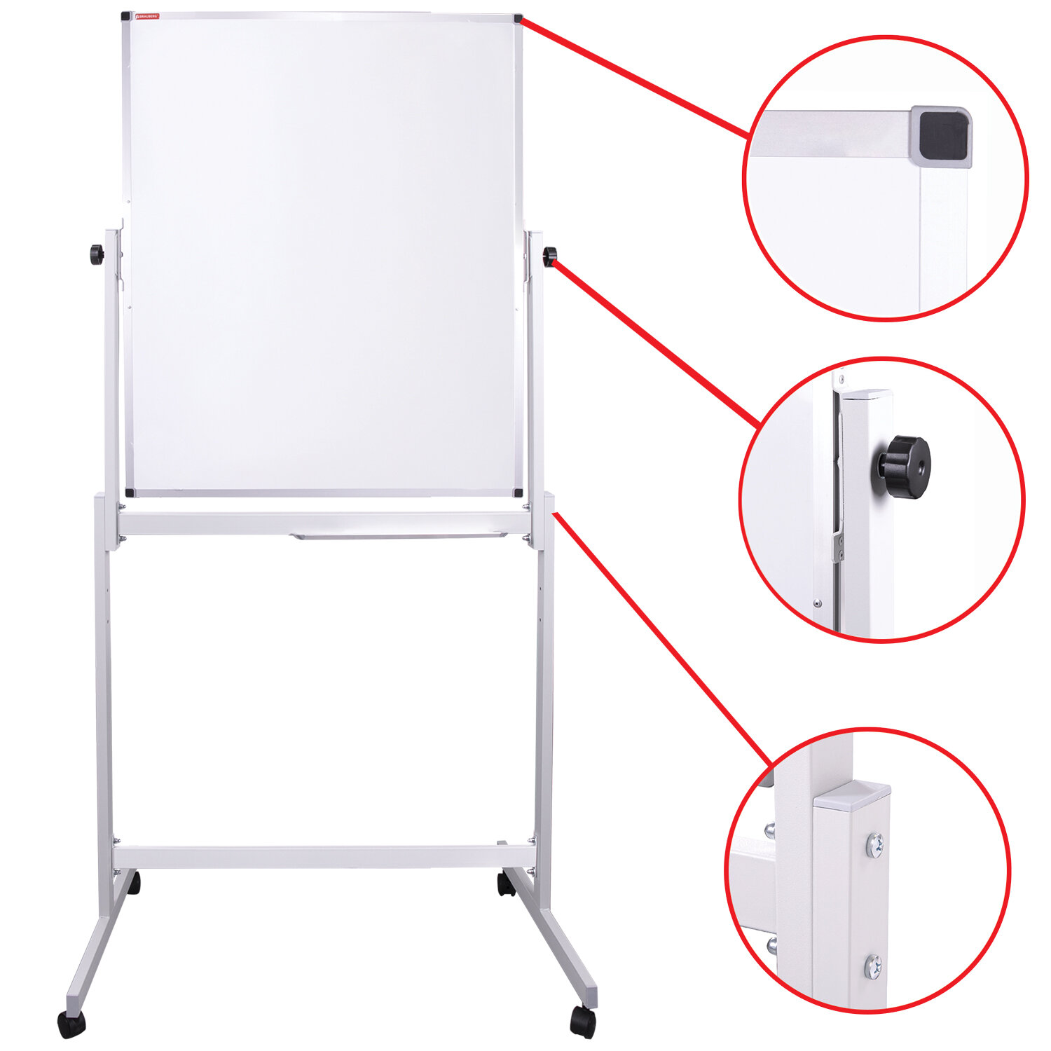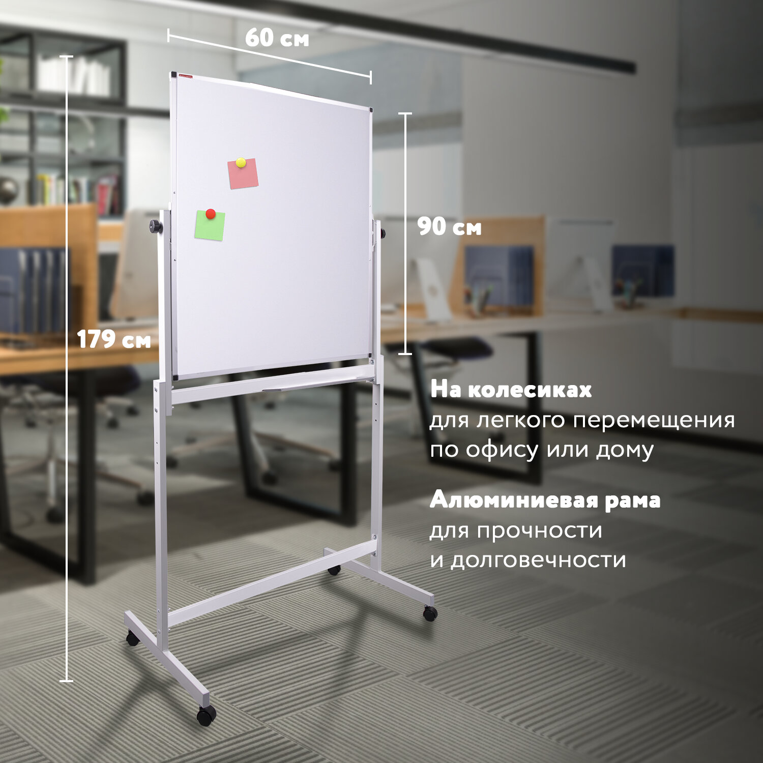 Лаковое покрытие предназначено для письма специальными маркерами для белой доски, а металлическая поверхность позволяет размещать информацию при помощи магнитов. Вращается в горизонтальной плоскости на 360°. Перемещается на колесиках. Алюминиевая рама придает доске необходимую прочность. Подставка для канцелярских принадлежностей позволяет всегда держать под рукой магниты, маркеры, стиратели и другие необходимые предметы. Элементы крепления входят в комплект. Защитная пленка предупреждает появление царапин, потертостей и сколов на рабочей поверхности доски при транспортировке и хранении продукции (перед началом работы необходимо удалить защитную плёнку). Размер: 90х60 см.