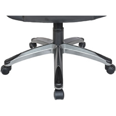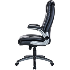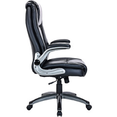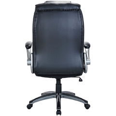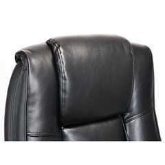 Обивка кресла выполнена из рециклированной кожи – современного материала, созданного из измельченных частиц натуральной кожи. По эластичности и прочности такая кожа максимально близка к натуральной, а также имеет запах выделанной кожи. Материал отлично пропускает воздух, что положительным образом сказывается на комфорте во время эксплуатации. Рециклированная кожа износоустойчива, кресло способно сохранять привлекательный внешний вид длительное время. Плотная набивка, пружинный блок, откидные подлокотники с мягкими накладками и широкое сиденье обеспечивают великолепную эргономику данной модели. Надёжный механизм "Топ-ган" позволяет осуществлять свободное качание с фиксацией в рабочем положении и регулировку силы отклонения под вес сидящего. Кресло выдерживает нагрузку до 125 кг.
