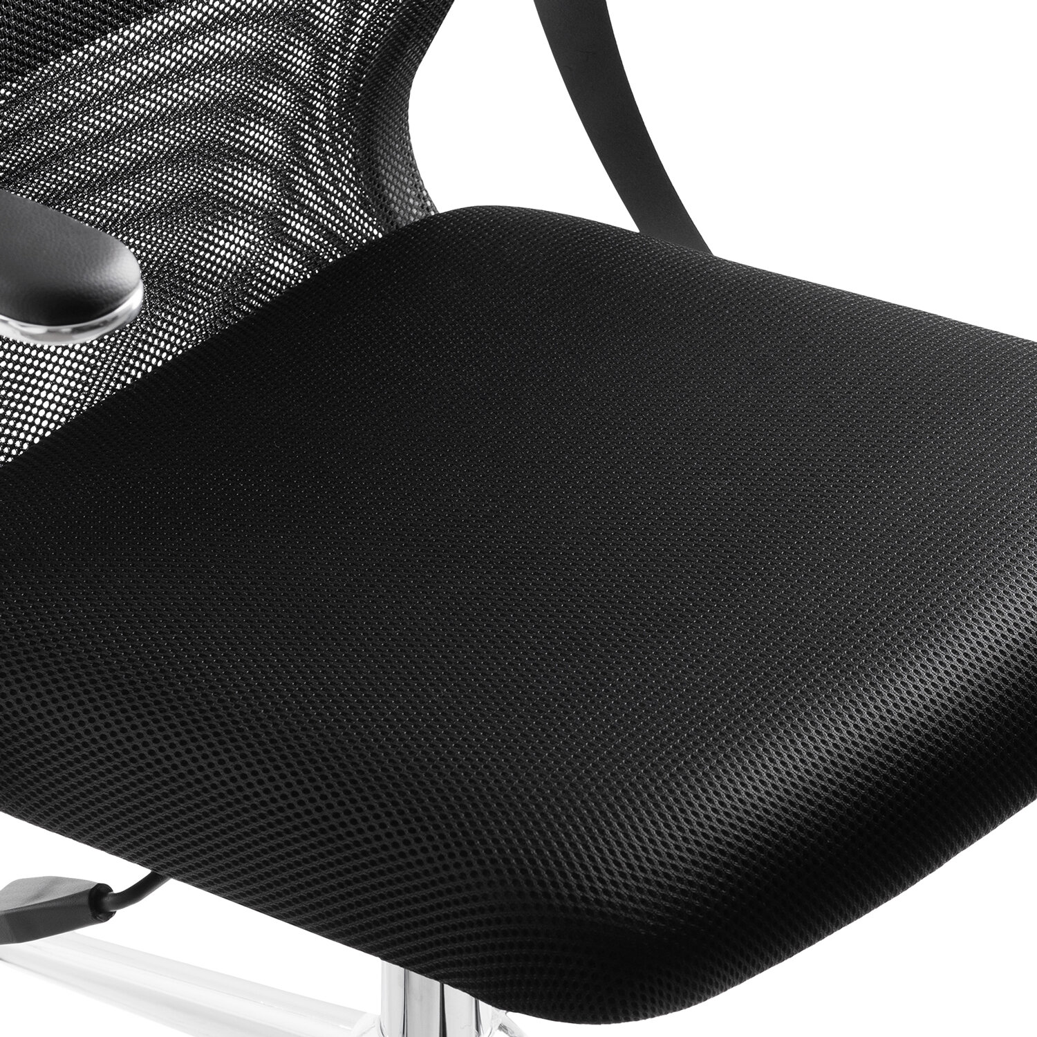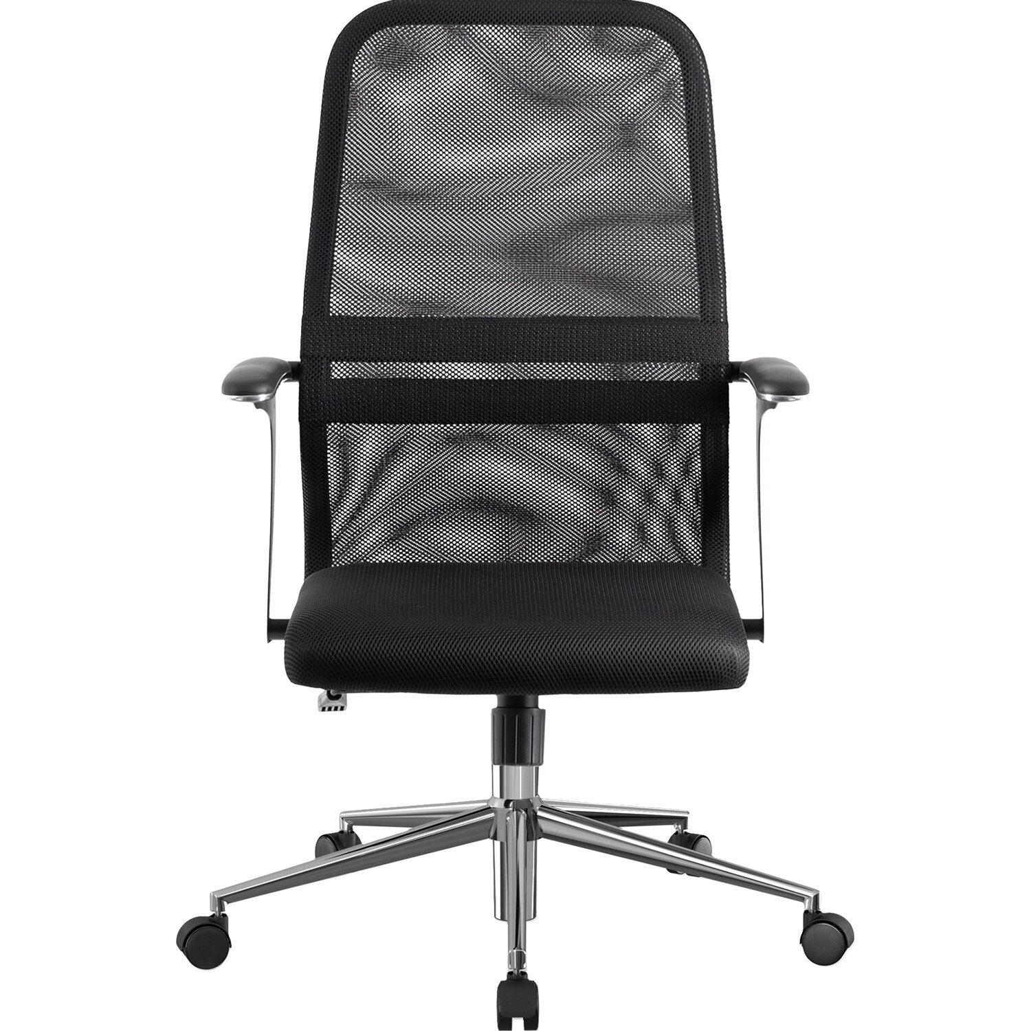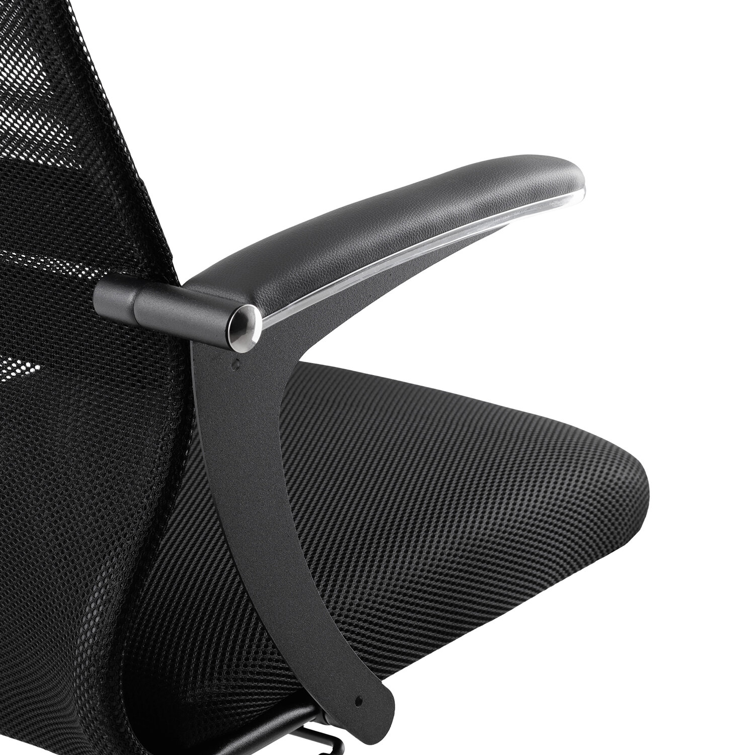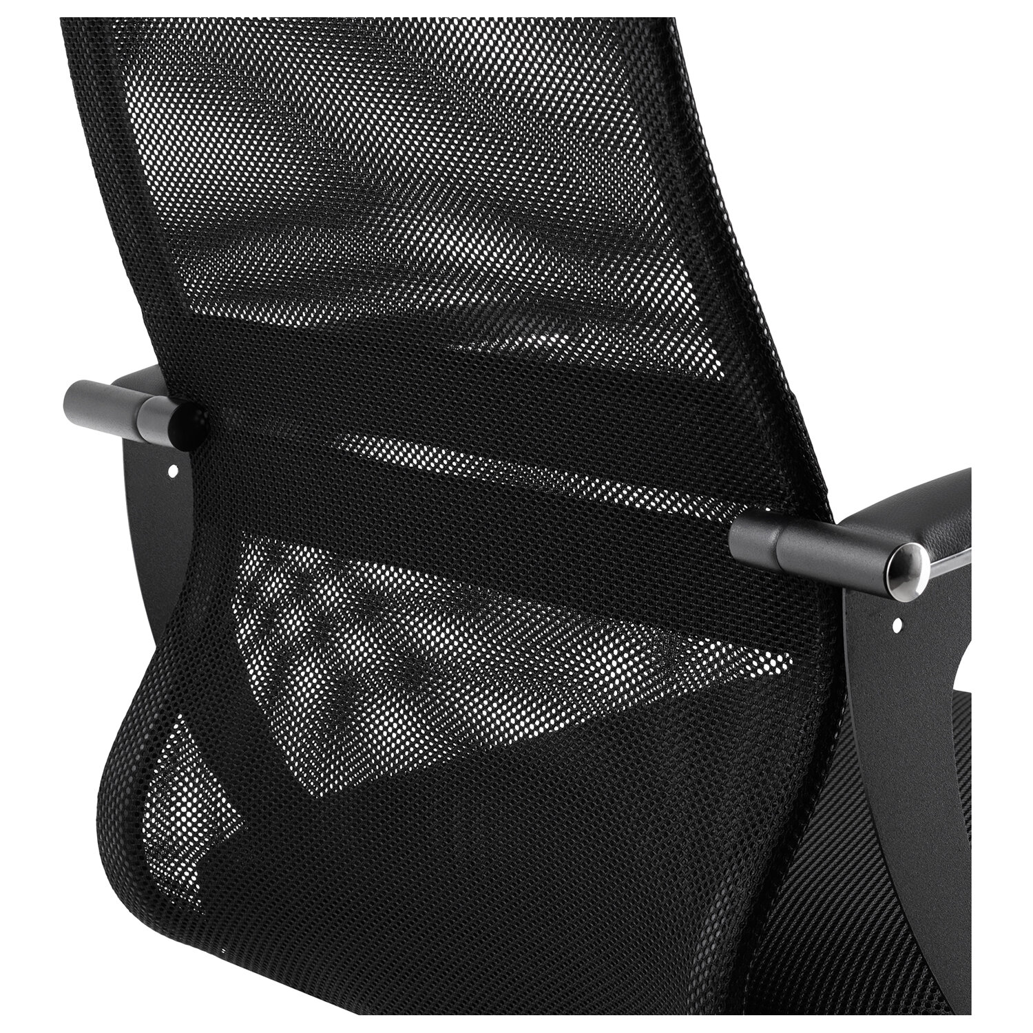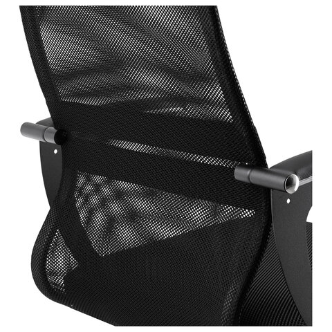 Спинка низкая, эргономичной формы с ярко выраженной поясничной поддержкой.Спинка имеет сверхпрочный стальной каркас с износостойким полимерным покрытием черного цвета.Сиденье средней жесткости, объемное на столярном каркасе.Обивка из износоустойчивой "дышащей" сетчатой ткани.Подлокотники современные "Бумеранг", стальные с полимерным покрытием черного цвета, c хромированным молдингом, с мягкими накладками из экокожи.Пятилучие - металлическое хромированное.Модель оснащена механизмом качания "Top-Gun" с регулировкой под вес и возможностью фиксации в рабочем положении.