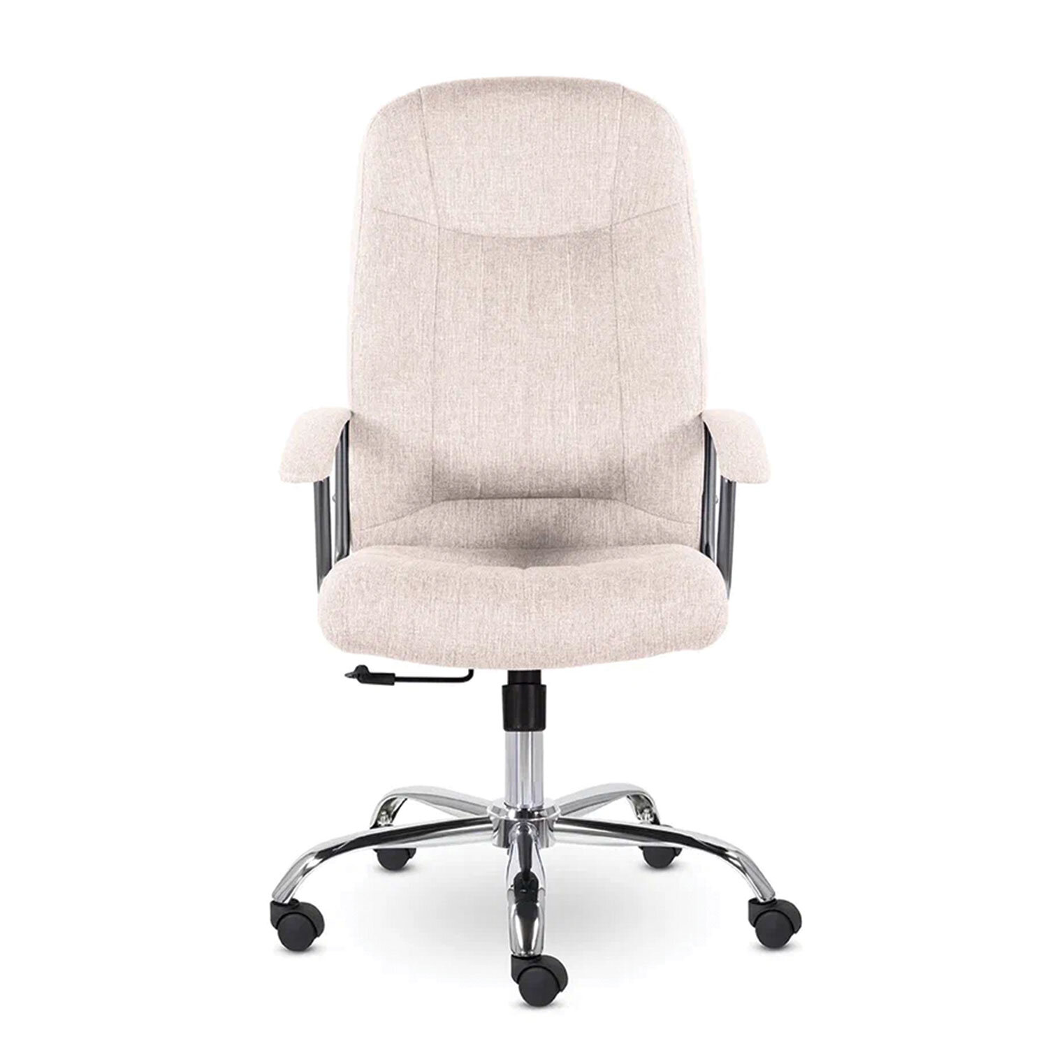 Материалы – ткань Moderno, бежевого цвета.Подлокотники – хромированные с мягкими накладками.Механизм качания – "Топ-Ган" с синхронным отклонением спинки и сиденья, а также с фиксацией в рабочем положении.Крестовина – хромированная.Газпатрон – хромированный, с высотой подъема 100 мм ± 10 позволяет плавно регулировать высоту сиденья относительно пола.Ролики – стандарт BIFMA 5,1 (США), диаметр штока – 11 мм, покрытие – полиуретан.Каркас – немонолитный.Максимальная рекомендованная нагрузка – до 120 кг.Кресло с мягкими увеличенными подушками. Широкая эргономичная спинка имеет две горизонтальные прострочки, которые отделяют подголовник от основной части спинки. Благодаря глубокому сиденью в кресле будет удобно человеку среднего и высокого роста. Длинные хромированные подлокотники способствуют комфортной посадке в кресле.