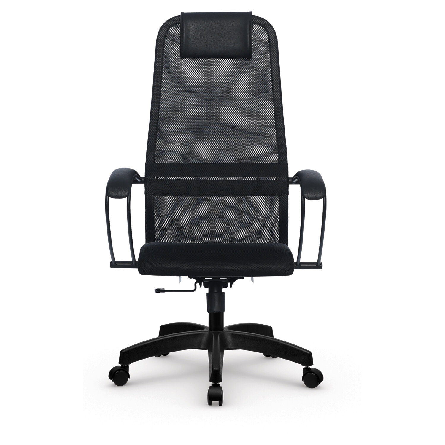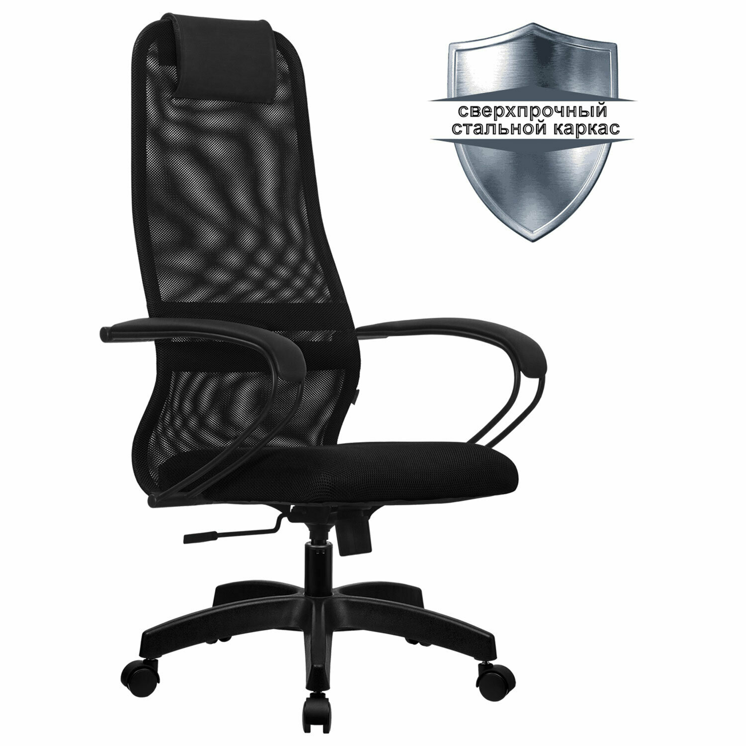 Спинка высокая, эргономичной формы с ярко выраженной поясничной поддержкой.Спинка имеет сверхпрочный стальной каркас с износостойким полимерным покрытием черного цвета.Спинка снабжена мягким комфортным подголовником.Сиденье средней жесткости, объемное на столярном каркасе.Обивка из износоустойчивой "дышащей" сетчатой ткани.Подлокотники стальные классические, с мягкими накладками из экокожи.Прочное пластиковое пятилучие.Модель оснащена механизмом качания "Top-Gun" с регулировкой под вес и возможностью фиксации в рабочем положении.