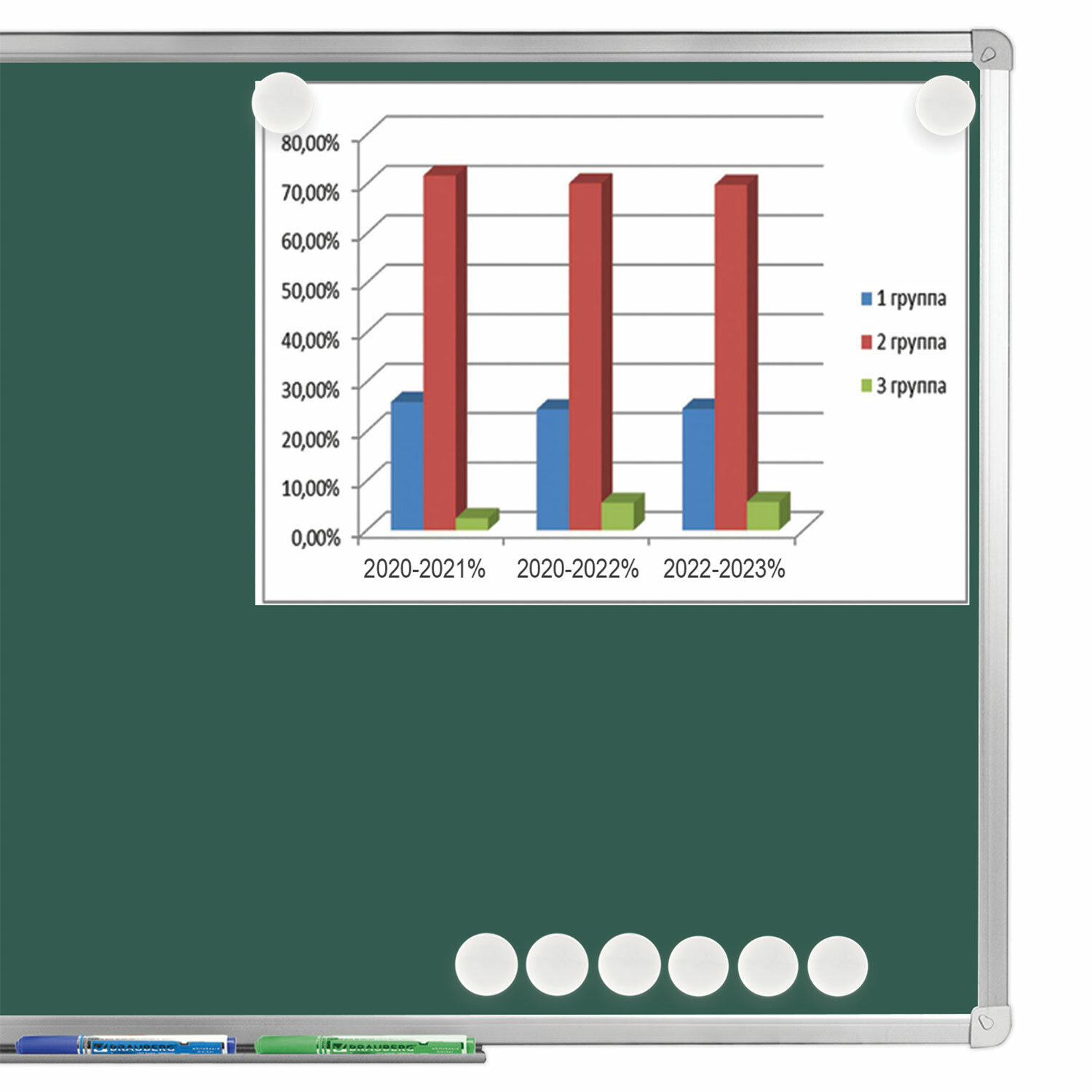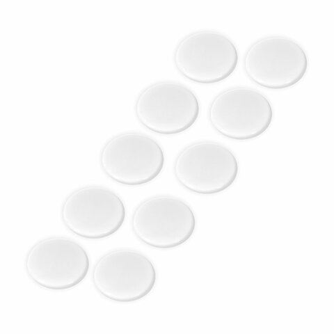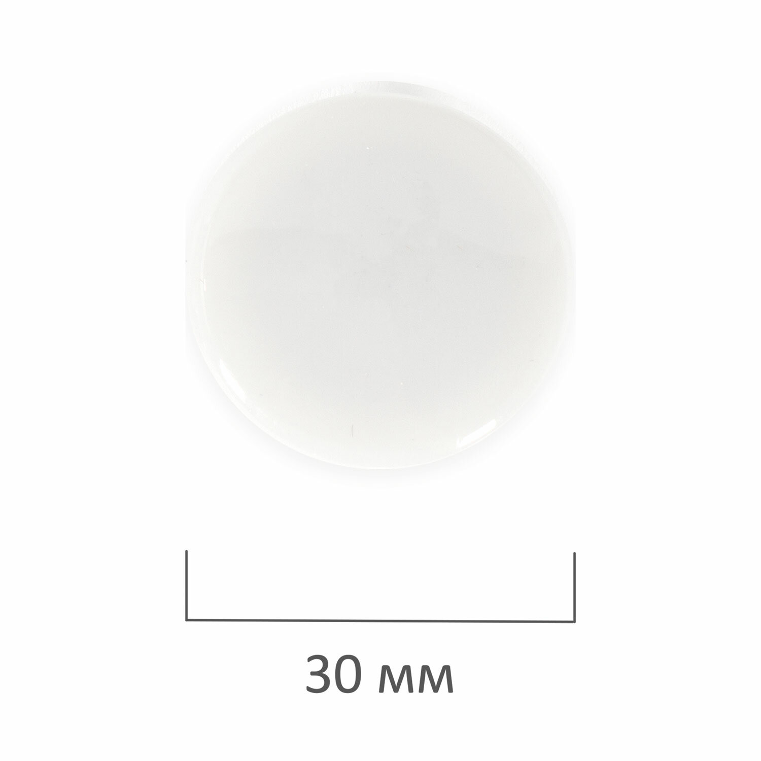 Диаметр магнита составляет 30 мм. 10 штук в комплекте. Надежно удерживаются на любой железной или стальной поверхности. Магниты круглой формы выполнены из пластика белого цвета. Поставляются в удобной блистерной упаковке с европодвесом.