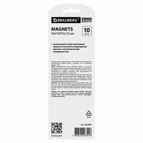 Стильные магниты BRAUBERG "BLACK&WHITE" помогут надежно прикрепить листы бумаги к магнитной поверхности досок, витрин и флипчартов.