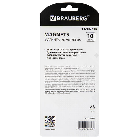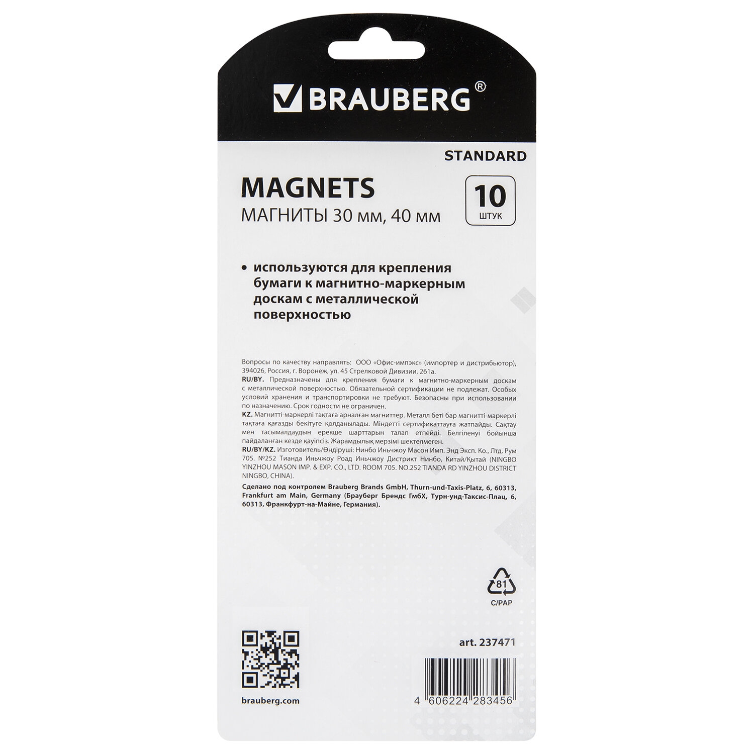 Магниты BRAUBERG "STANDARD", НАБОР 30 мм - 6 шт., 40 мм - 4 шт., ассорти, 237471