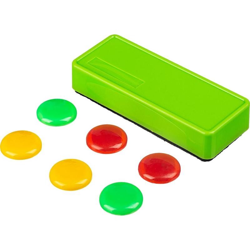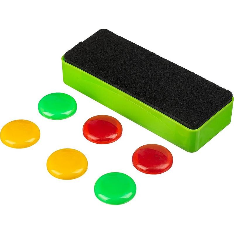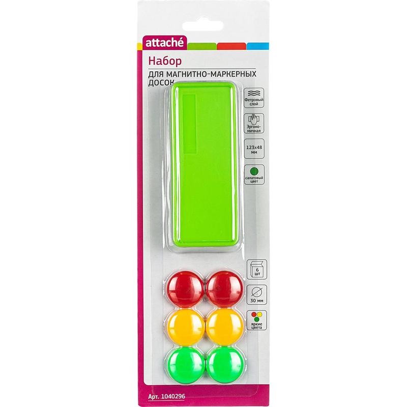Набор для магнитно-маркерных досок Attache состоит из: губки-стирателя, 6 магнитных держателей. Губка предназначена для стирания маркеров с магнитно-маркерных досок сухим способом. Оснащена магнитной пластиной для крепления к доске. Размер губки: 123Ч48 мм. Магнитные держатели для досок предназначены для фиксирования информации на металлических поверхностях магнитно-маркерных досок, флипчартов или витрин. Диаметр 30 мм. Цвет: в ассортименте. Набор поставляется в блистерной упаковке.