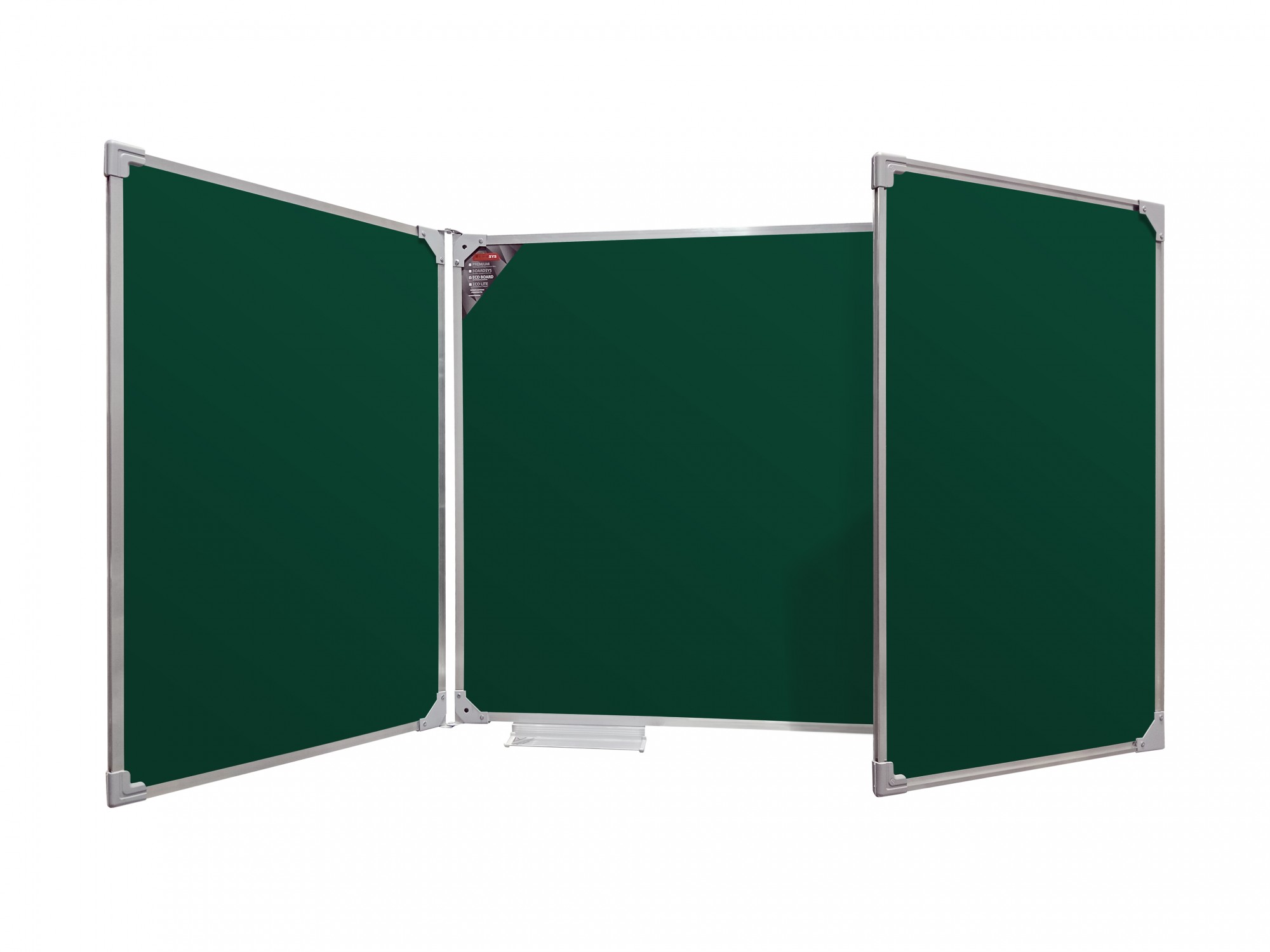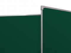Трёхсекционная магнитно-меловая доска BoardSYS предназначена для нанесения информации мелом различных цветов. Поверхность доски также позволяет прикреплять листы бумаги, карты и т.п. с помощью магнитов. Доска имеет 2 створки, что позволяет иметь 5 рабочих поверхностей. В комплект входит полочка для мела 20 см. Обрамление: алюминиевый профиль, скрепленный пластиковыми уголками. Задняя сторона укреплена гальванизированным металлическим листом для придания необходимой жесткости и для защиты от деформации