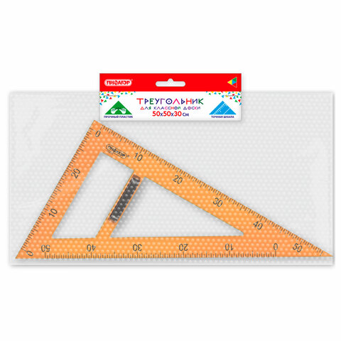 Изготовлен из прочного пластика. Длина шкалы – 50 см, углы – 30° и 60°. Обладает четкой контрастной печатной разметкой. Цвет треугольника – оранжевый. Упакован в воздушно-пузырчатую пленку.